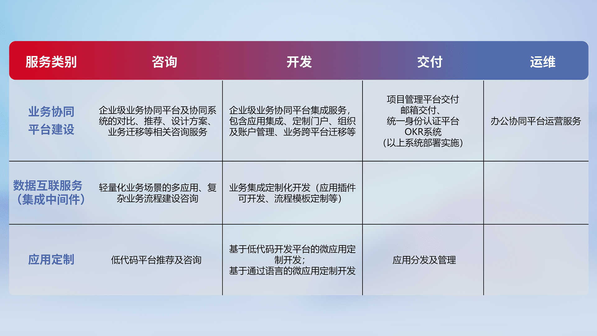 针对钉钉、、、、企微、、IDaas等平台级产品提供产品的规划、、方案、、、、交付、、、、定制化开发等服务,,,,实现如统一协同办公、、智能客户服务、、、混合会议管理、、、、智能数据查询、、、、等业务场景,,,,实现数字化转型。。。